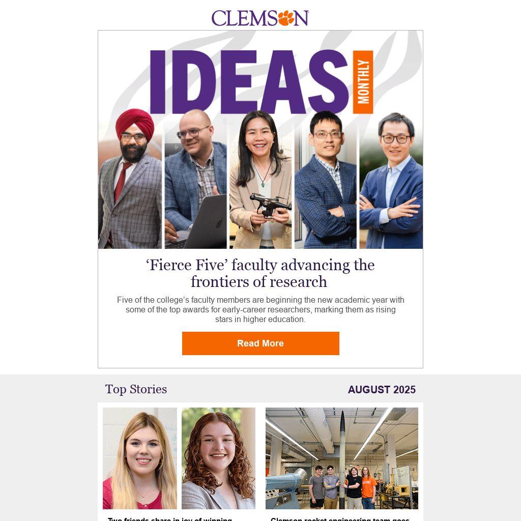 Inquiry and Discovery in Engineering and Science (IDEAS) Monthly is published by the PROMO Office in Clemson University’s College of Engineering, Computing and Applied Sciences. Contact the team with feedback or story suggestions.