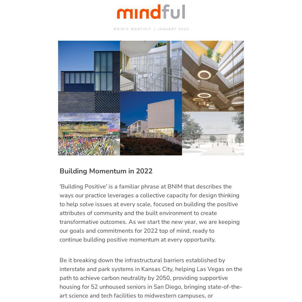 'Building Positive' is a familiar phrase at BNIM that describes the ways our practice leverages a collective capacity for design thinking to help solve issues at every scale, focused on building the positive attributes of community and the built environment to create transformative outcomes. As we start the new year, we are keeping our goals and commitments for 2022 top of mind, ready to continue building positive momentum at every opportunity.