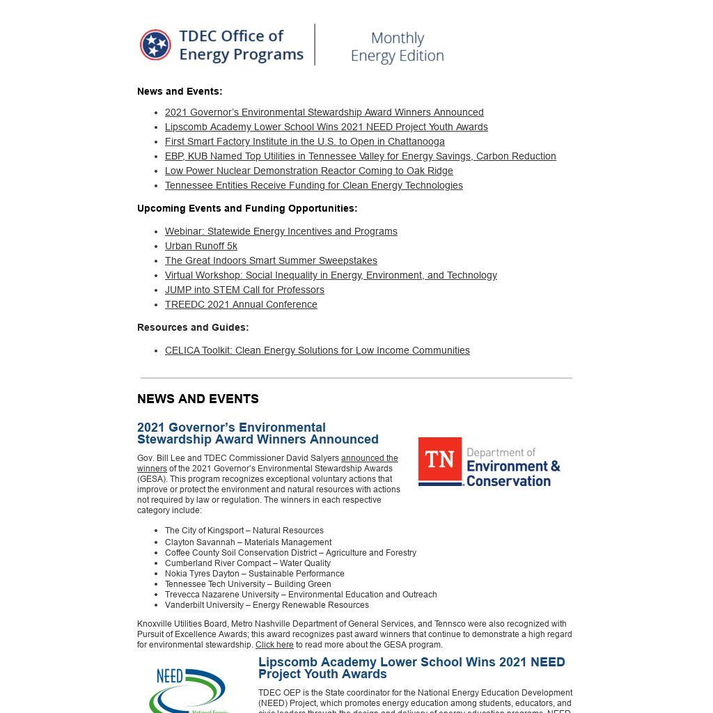 TDEC OEP is the State coordinator for the National Energy Education Development (NEED) Project, which promotes energy education among students, educators, and civic leaders through the design and delivery of energy education programs. NEED works with energy companies, government agencies, and community organizations to bring balanced energy programs to the nation’s schools. NEED honors schools across the country through its NEED Project Youth Awards for Energy Achievement, a competition in which teachers take their energy education programs beyond the classroom and encourage students to engage in school and community outreach to share what they have learned about energy efficiency and conservation.