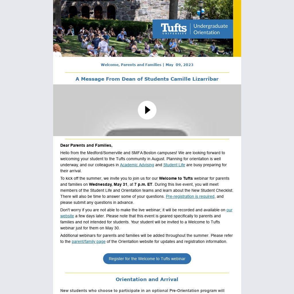 During the summer, we will keep you updated with specific details on arrival, move-in, and the parent/family orientation programs and schedule. In the meantime, please refer to the Undergraduate Orientation web page and the Office of Residential Life and Learning web page for updates. We will also send periodic emails and invitations to additional webinars to introduce you to Student Life team members and campus partners as well as various campus resources.