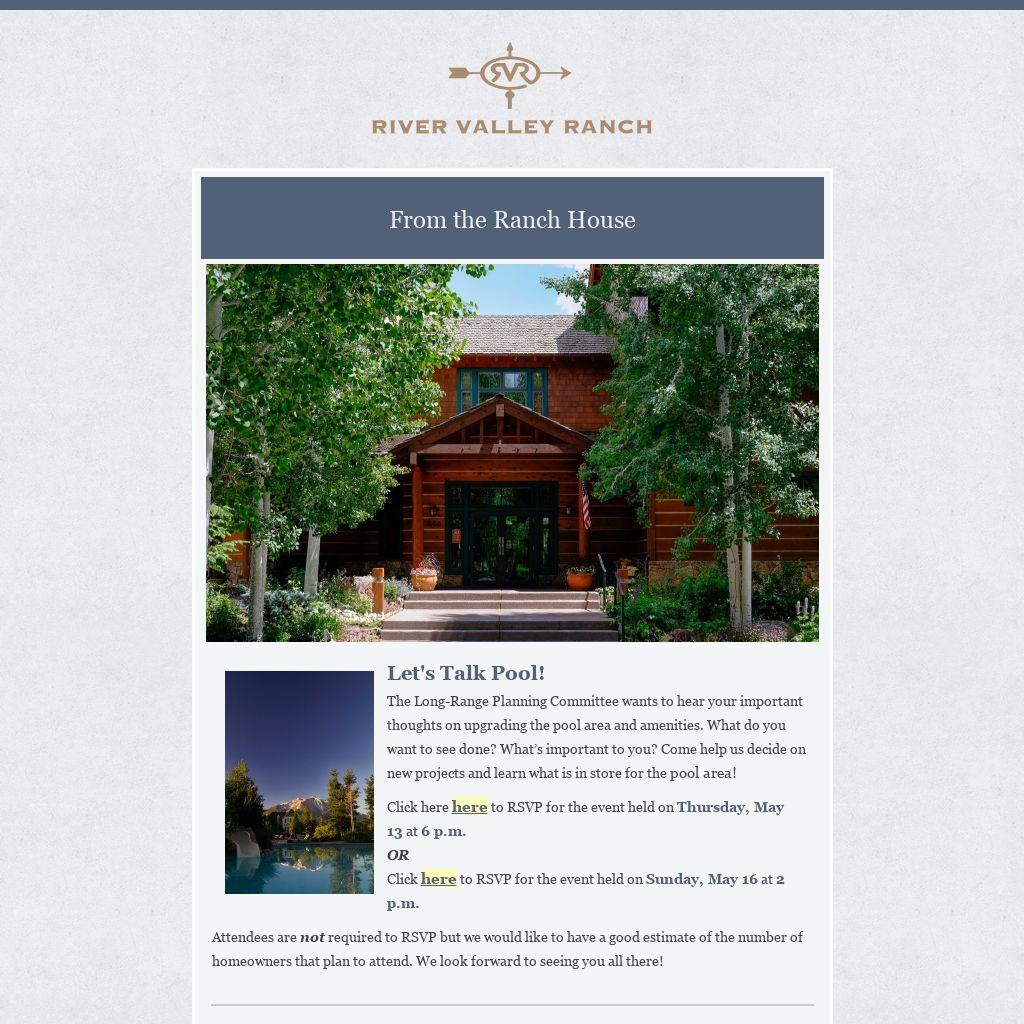 - RVR's Memorial Day event is scheduled for Saturday, May 29 from 11 a.m. -1 p.m. Reservations can be completed through the RVR booking site under pool reservation blocks. A raffle will take place at 12:45 p.m., participants must be present to win.