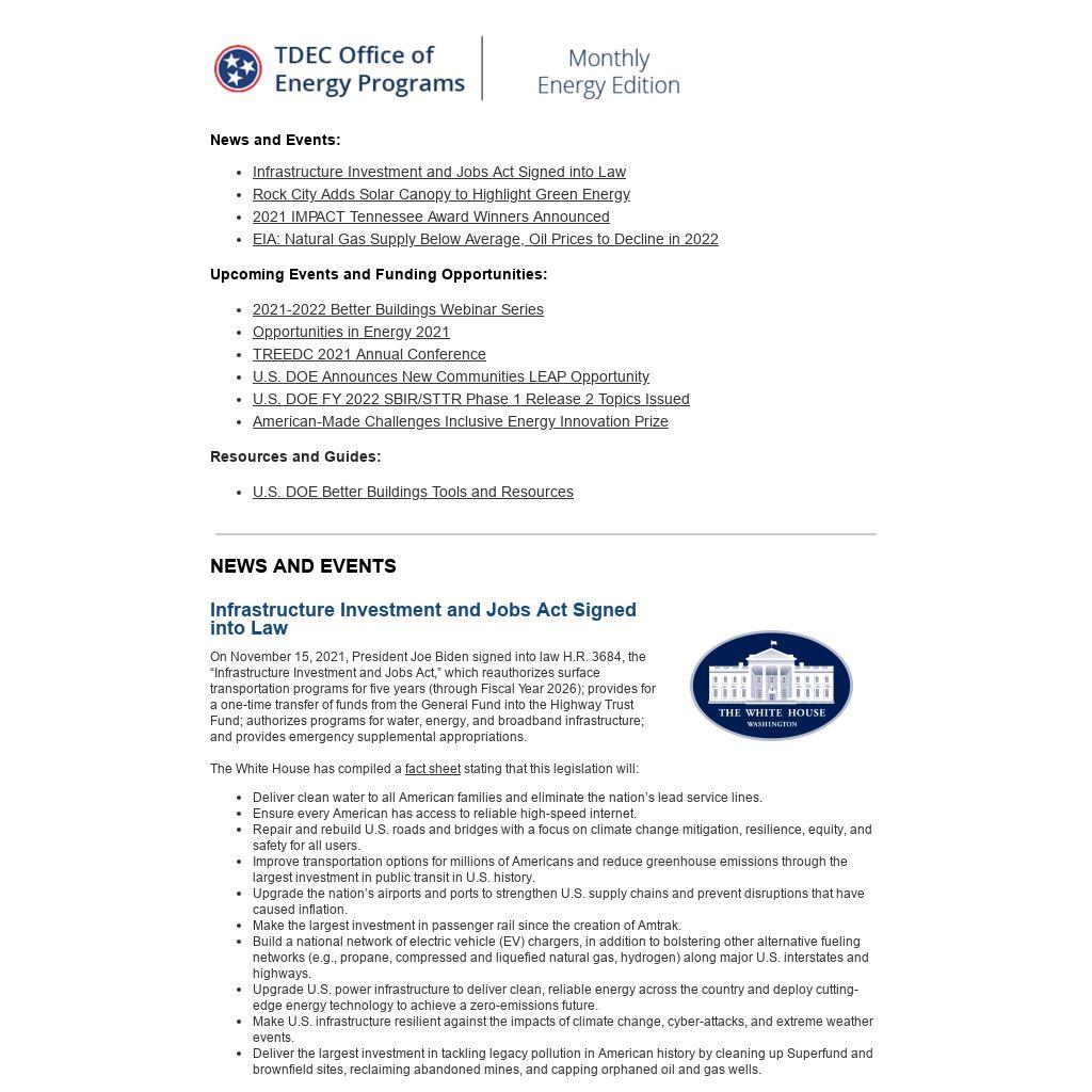 The Tennessee Renewable Energy & Economic Development Council (TREEDC) will hold its annual conference at Tennessee Tech University from December 9-10. This year’s conference will include a panel on post-pandemic economic recovery resources, COVID-19 assistance programs, and lessons learned from Tennessee local government leaders. A second panel will feature speakers from TDEC’s Office of Energy Programs, the U.S. Department of Agriculture, TVA, and Cooley Public Strategies to discuss opportunities in renewable energy and green infrastructure in Tennessee. The event will also recognize 2021 TREEDC Champion Award winners and will feature exhibitors, networking opportunities, and introductions to start-up companies that are part of the TREEDC network. Click here to access the conference agenda. Click here to register.