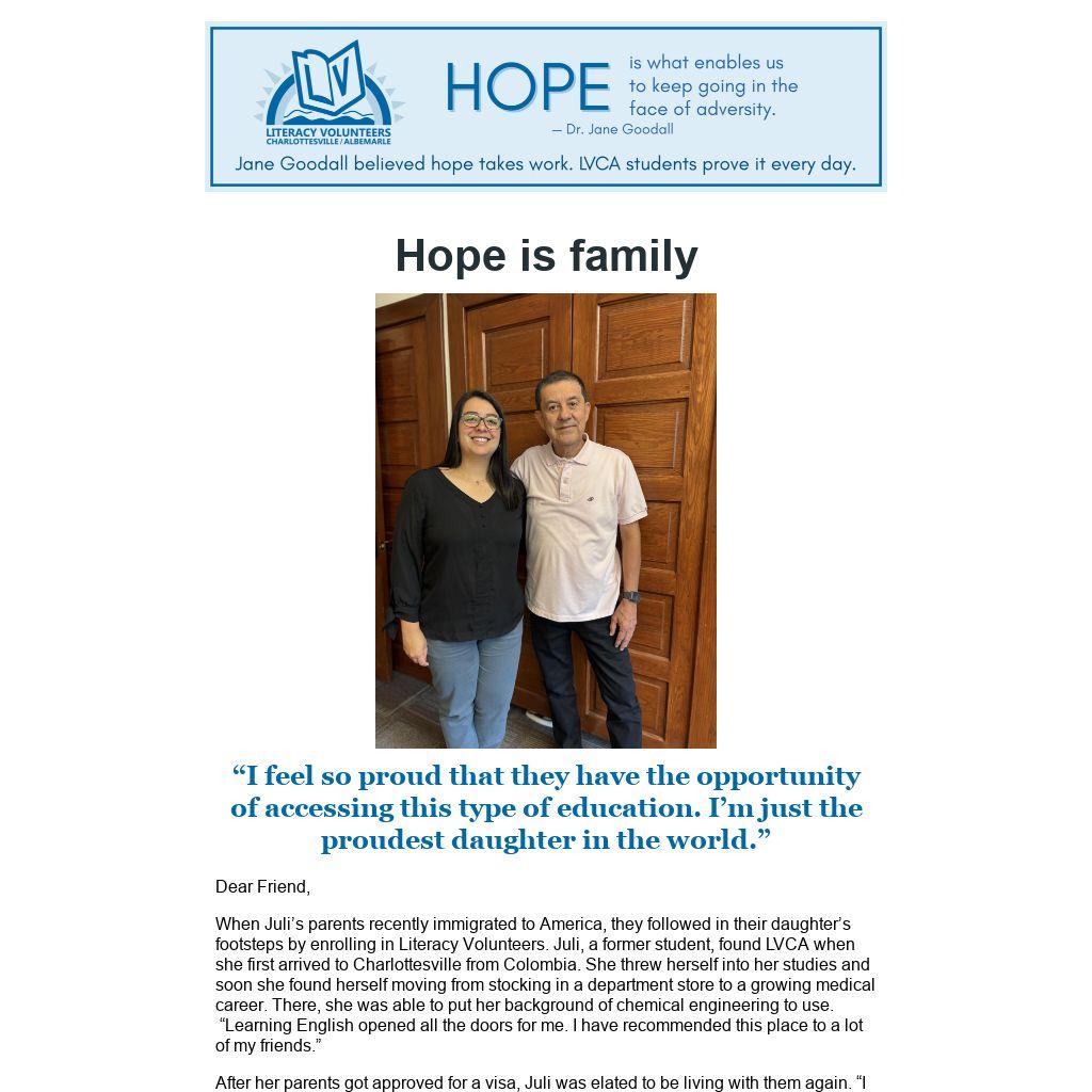 When Juli’s parents recently immigrated to America, they followed in their daughter’s footsteps by enrolling in Literacy Volunteers. Juli, a former student, found LVCA when she first arrived to Charlottesville from Colombia. She threw herself into her studies and soon she found herself moving from stocking in a department store to a growing medical career. There, she was able to put her background of chemical engineering to use. “Learning English opened all the doors for me. I have recommended this place to a lot of my friends.”