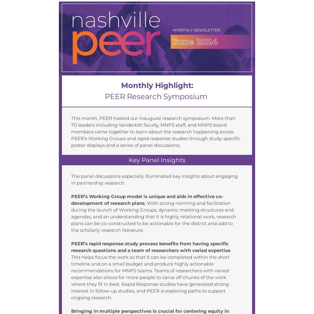 This month, PEER hosted our inaugural research symposium. More than 70 leaders including Vanderbilt faculty, MNPS staff, and MNPS board members came together to learn about the research happening across PEER’s Working Groups and rapid response studies through study-specific poster displays and a series of panel discussions.