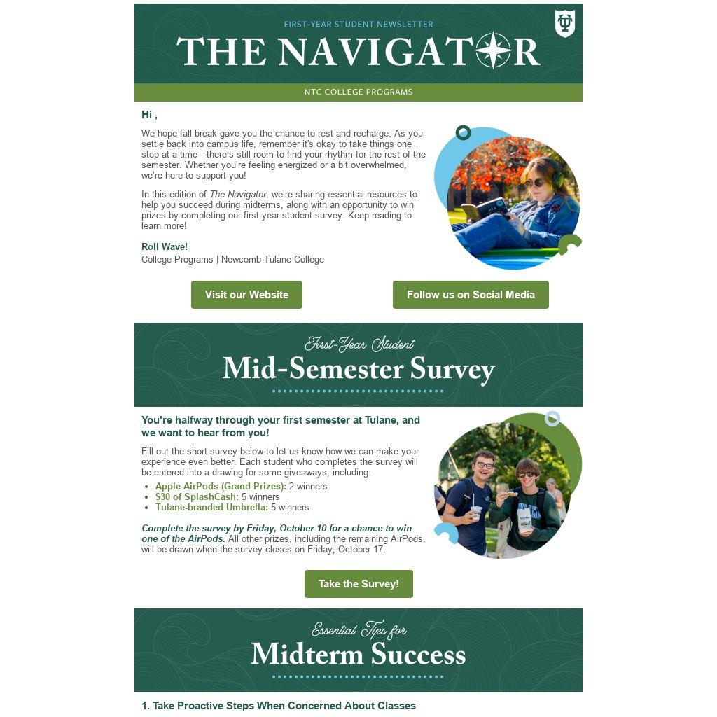 In this edition of The Navigator, we’re sharing essential resources to help you succeed during midterms, along with an opportunity to win prizes by completing our first-year student survey. Keep reading to learn more!
