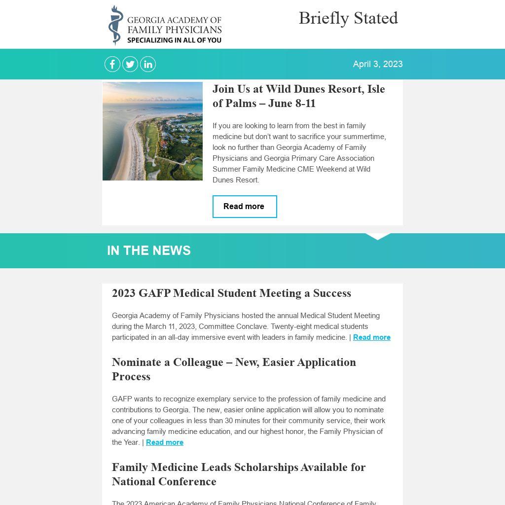 Copyright 2023 Georgia Academy of Family Physicians To ensure that e-mails from GAFP are delivered to your inbox, please add gafp@gafp.org to your address book or list of approved senders.