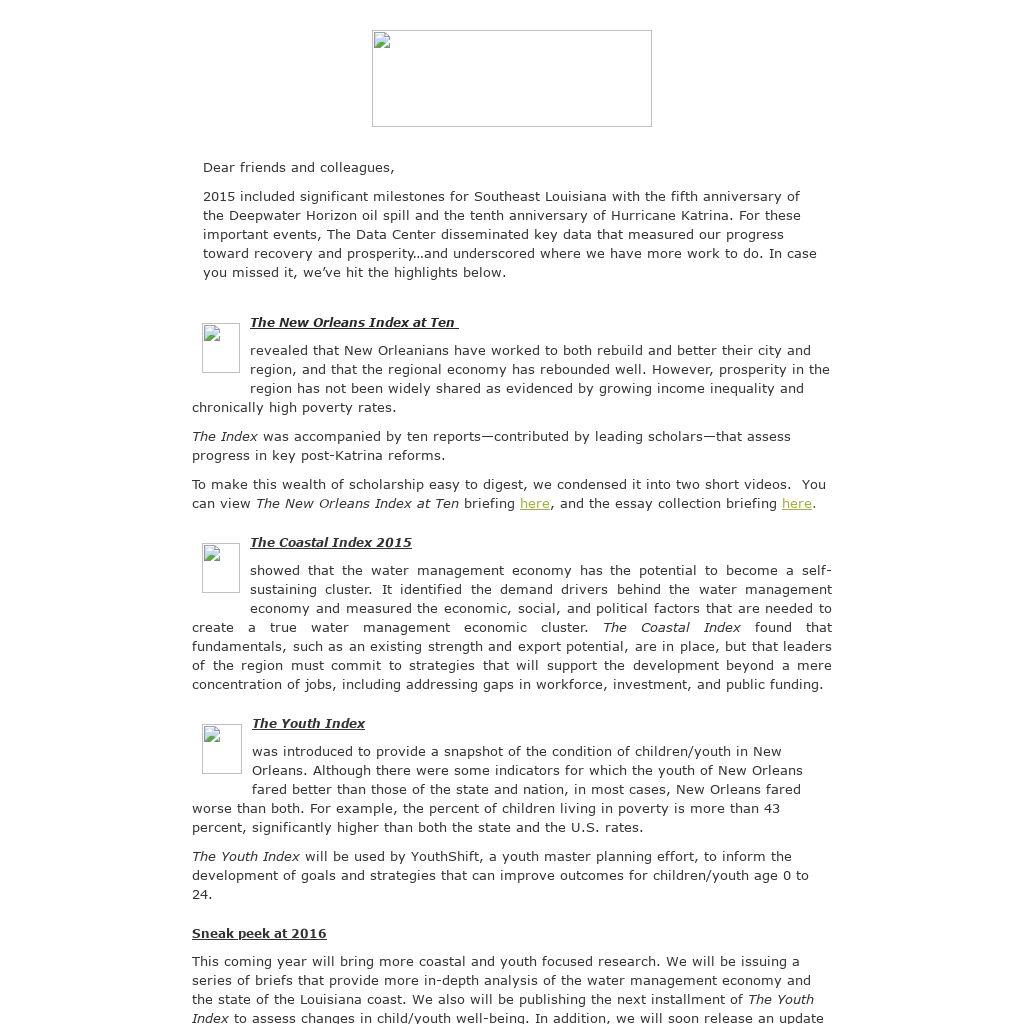 This coming year will bring more coastal and youth focused research. We will be issuing a series of briefs that provide more in-depth analysis of the water management economy and the state of the Louisiana coast. We also will be publishing the next installment of The Youth Index to assess changes in child/youth well-being. In addition, we will soon release an update to one of our most popular data resources, Who Lives in New Orleans and Metro Parishes Now?
