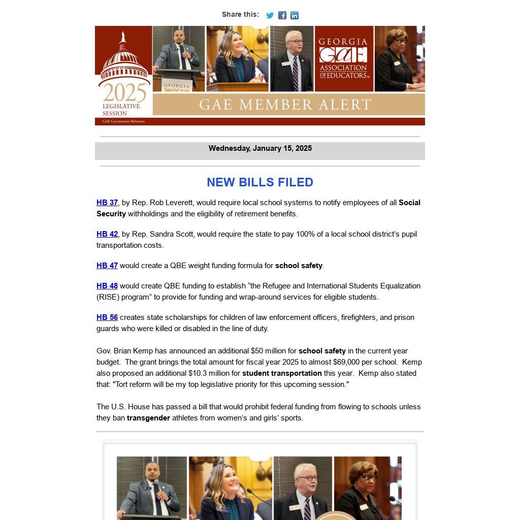 HB 37, by Rep. Rob Leverett, would require local school systems to notify employees of all Social Security withholdings and the eligibility of retirement benefits. HB 42, by Rep. Sandra Scott, would require the state to pay 100% of a local school district’s pupil transportation costs.