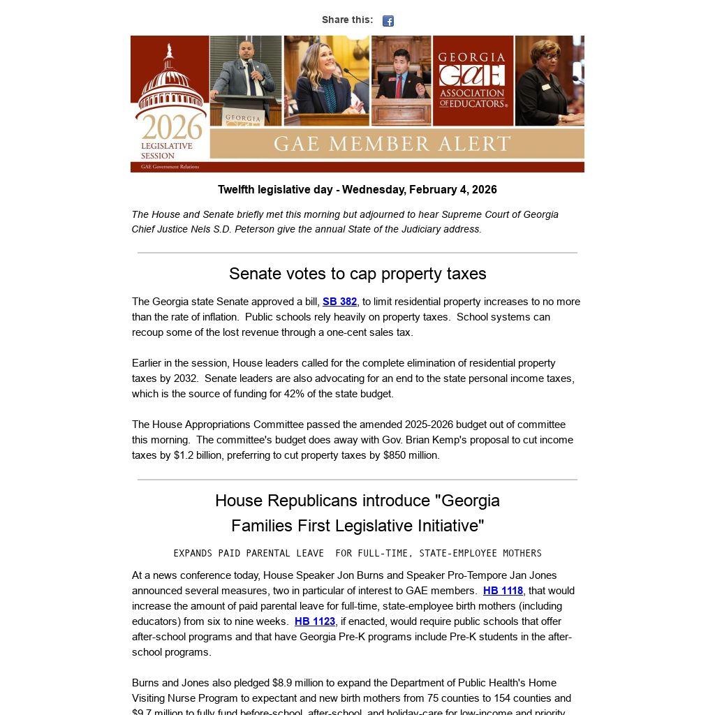 At a news conference today, House Speaker Jon Burns and Speaker Pro-Tempore Jan Jones announced several measures, two in particular of interest to GAE members.  HB 1118, that would increase the amount of paid parental leave for full-time, state-employee birth mothers (including educators) from six to nine weeks.  HB 1123, if enacted, would require public schools that offer after-school programs and that have Georgia Pre-K programs include Pre-K students in the after-school programs.