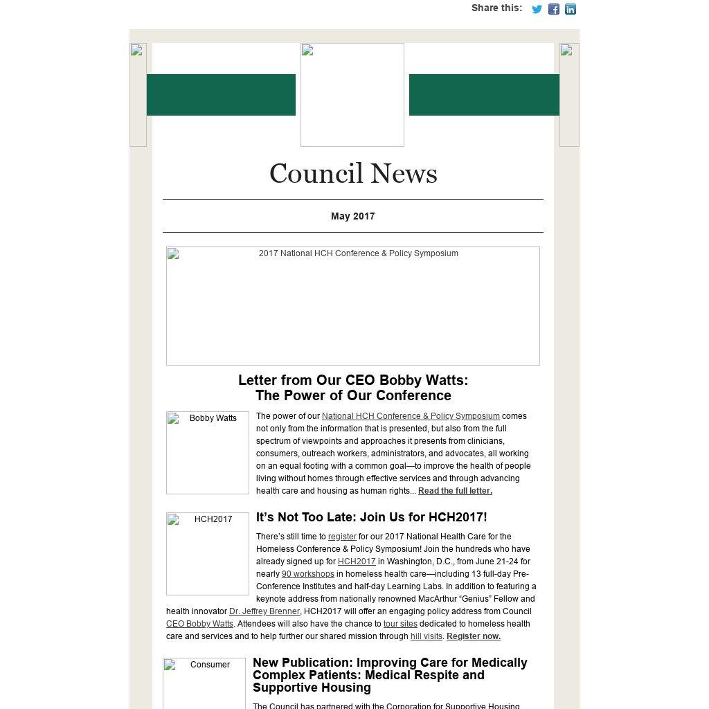 There’s still time to register for our 2017 National Health Care for the Homeless Conference & Policy Symposium! Join the hundreds who have already signed up for HCH2017 in Washington, D.C., from June 21-24 for nearly 90 workshops in homeless health care—including 13 full-day Pre-Conference Institutes and half-day Learning Labs. In addition to featuring a keynote address from nationally renowned MacArthur “Genius” Fellow and health innovator Dr. Jeffrey Brenner, HCH2017 will offer an engaging policy address from Council CEO Bobby Watts. Attendees will also have the chance to tour sites dedicated to homeless health care and services and to help further our shared mission through hill visits. Register now.