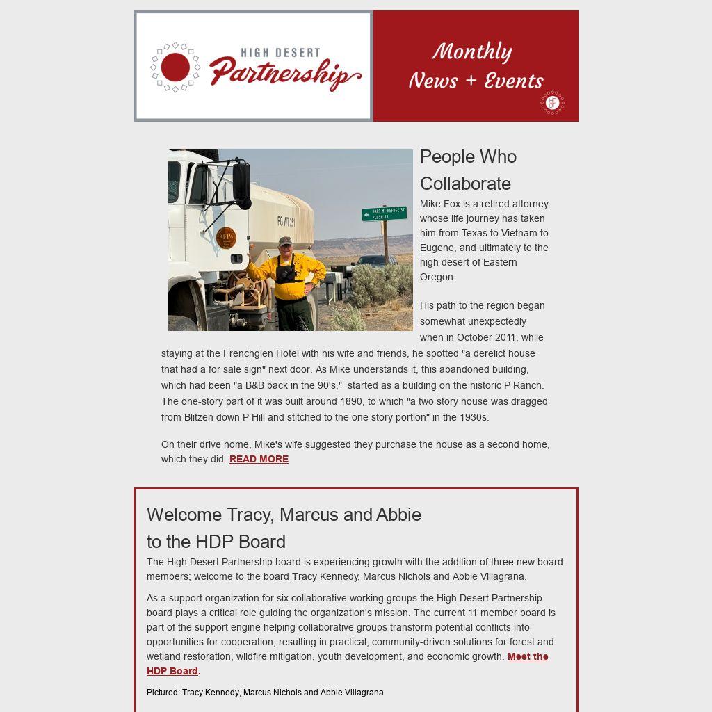 As a support organization for six collaborative working groups the High Desert Partnership board plays a critical role guiding the organization's mission. The current 11 member board is part of the support engine helping collaborative groups transform potential conflicts into opportunities for cooperation, resulting in practical, community-driven solutions for forest and wetland restoration, wildfire mitigation, youth development, and economic growth. Meet the HDP Board.