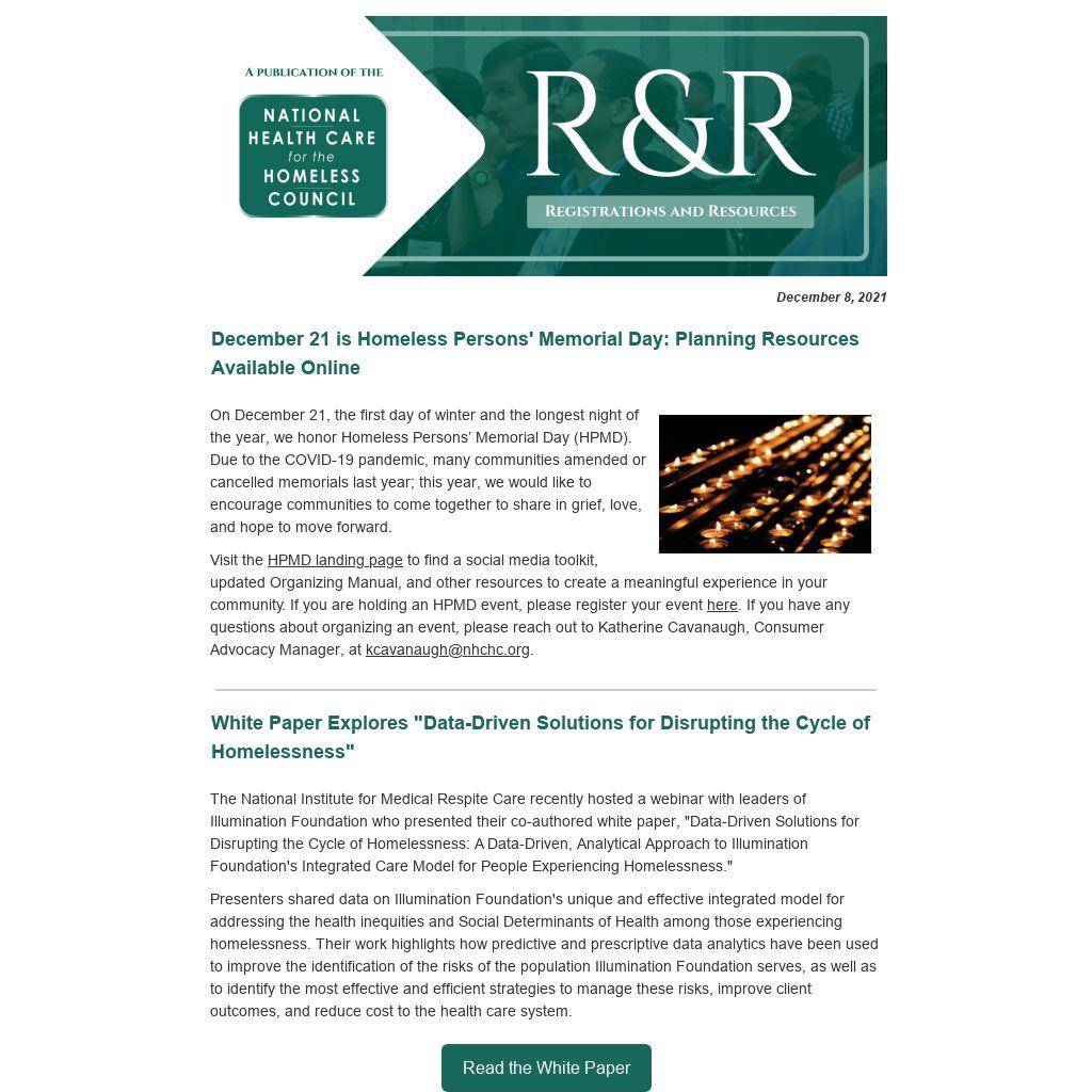 The National Institute for Medical Respite Care recently hosted a webinar with leaders of Illumination Foundation who presented their co-authored white paper, "Data-Driven Solutions for Disrupting the Cycle of Homelessness: A Data-Driven, Analytical Approach to Illumination Foundation's Integrated Care Model for People Experiencing Homelessness."