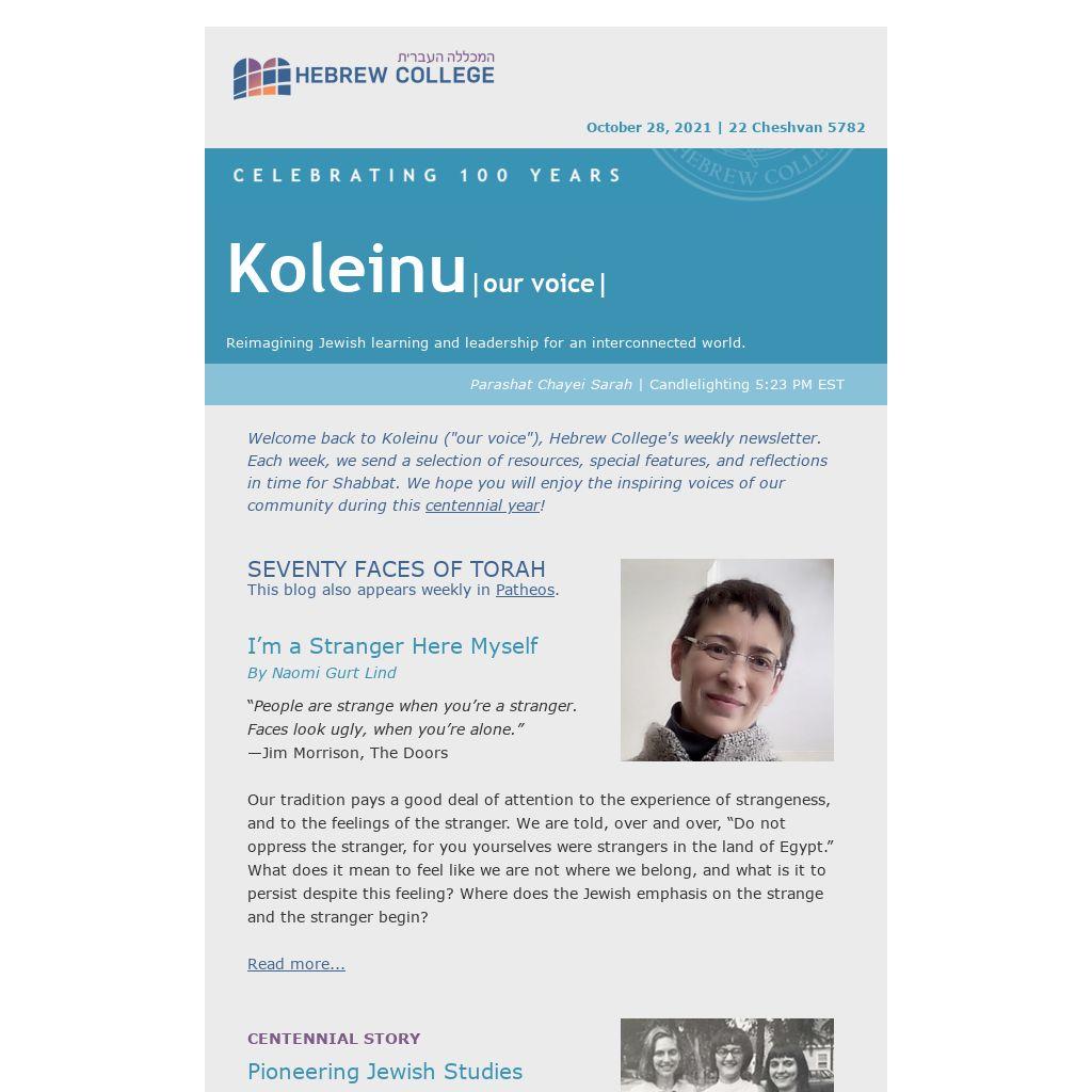 Welcome back to Koleinu ("our voice"), Hebrew College's weekly newsletter. Each week, we send a selection of resources, special features, and reflections in time for Shabbat. We hope you will enjoy the inspiring voices of our community during this centennial year!