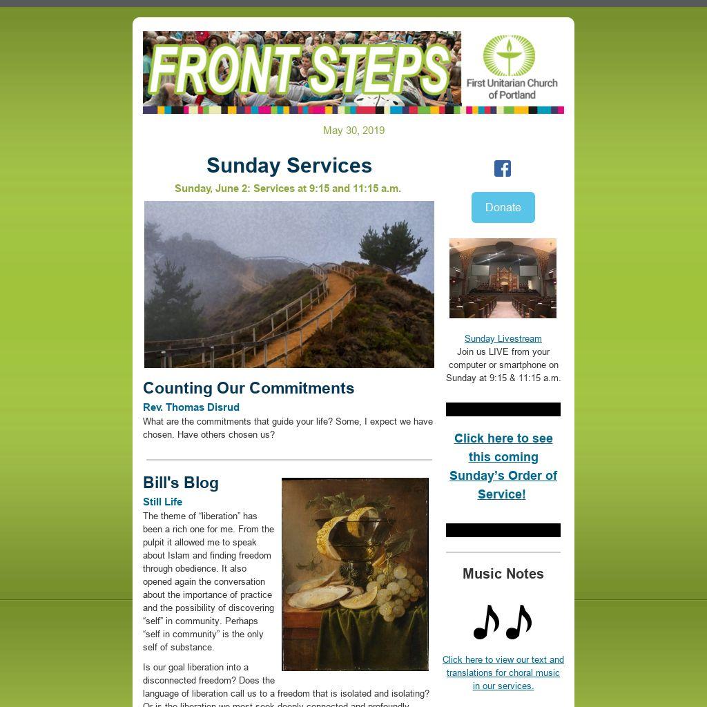 Do You Have an Item for E-news and/or the Sunday Bulletin?If you have an item you’d like published in our weekly Front Steps (eNews) or the Sunday Bulletin, please submit it to: