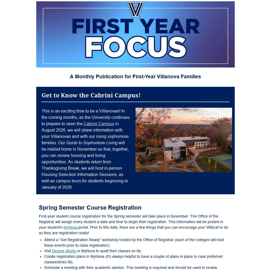 This is an exciting time to be a Villanovan! In the coming months, as the University continues to prepare to open the Cabrini Campus in August 2026, we will share information with your Villanovan and with our rising sophomore families. Our Guide to Sophomore Living will be mailed home in November so that, together, you can review housing and living opportunities. As students return from Thanksgiving Break, we will host in-person Housing Selection Information Sessions, as well as campus tours for students beginning in January of 2026.