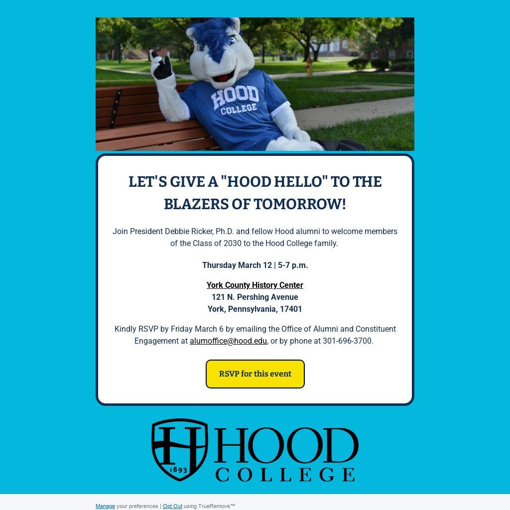 Kindly RSVP by Friday March 6 by emailing the Office of Alumni and Constituent Engagement at alumoffice@hood.edu, or by phone at 301-696-3700.