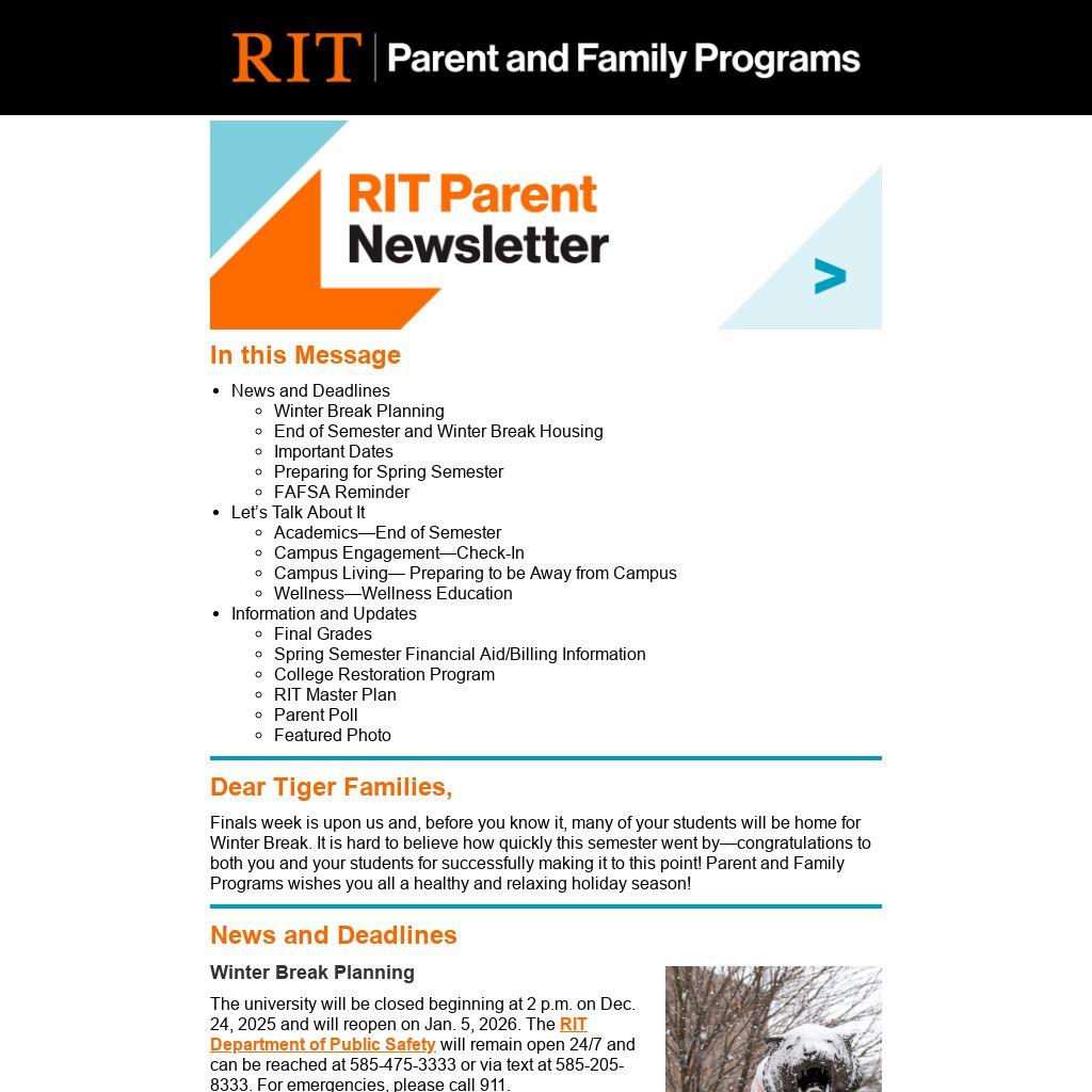 If they haven’t already done so, please make sure your student (if living in RIT housing) completes the End of Semester - Winter Break Plan. This form allows RIT to better serve our students during this time and includes the end of semester instructions and important information regarding on-campus circulation over break. Students that do not complete this form may experience swipe access interruptions.