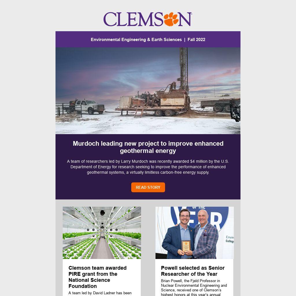 The Environmental Engineering & Earth Sciences Newsletter is published by the Department and the PROMO Office in Clemson University’s College of Engineering, Computing and Applied Sciences.