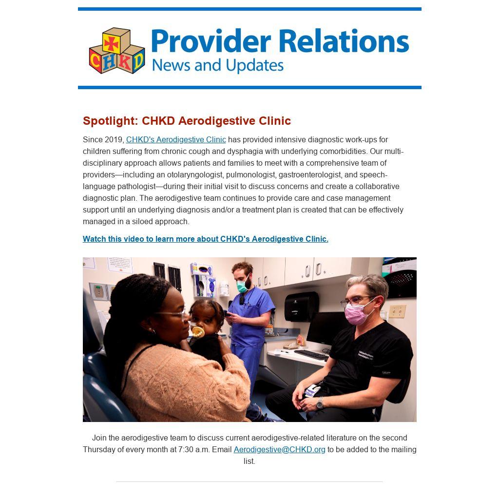 The preferred distribution method of the Provider Relations newsletter is via email. Please contact a CHKD Provider Relations Liaison to be added to our email distribution list.