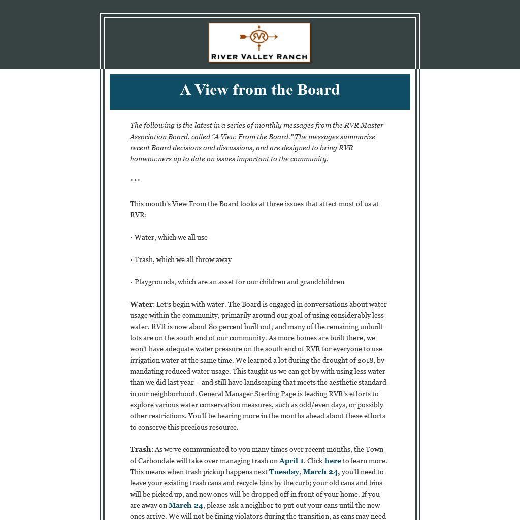 The following is the latest in a series of monthly messages from the RVR Master Association Board, called “A View From the Board.” The messages summarize recent Board decisions and discussions, and are designed to bring RVR homeowners up to date on issues important to the community.