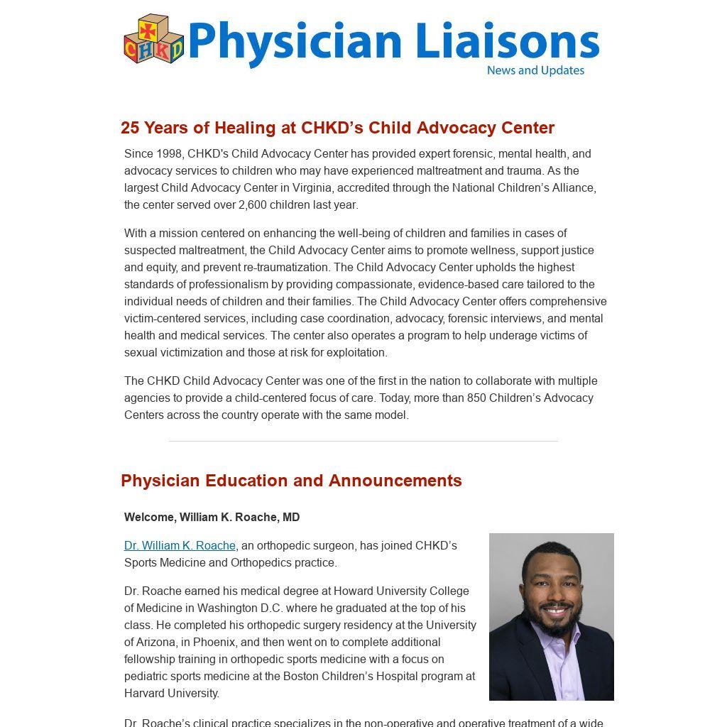The preferred distribution method of the Physician Liaison newsletter is via email. Please contact a CHKD Physician Liaison to be added to our email distribution list.