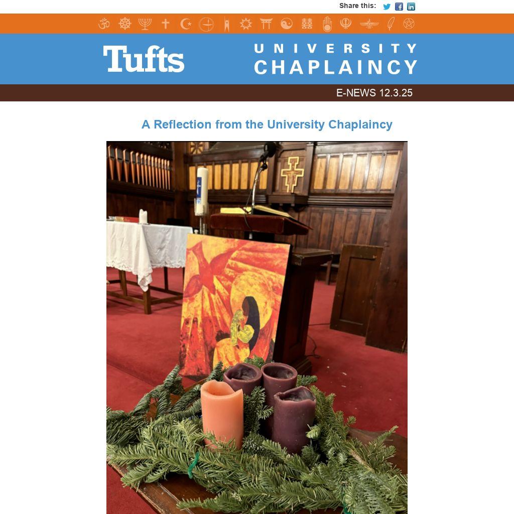 The University Chaplaincy is a dynamic hub supporting religious, spiritual, ethical, and cultural life for all members of the Tufts community. We provide spiritual care, support religious and philosophical communities, educate about spiritual and ethical issues in society and the world, and promote multifaith engagement.
