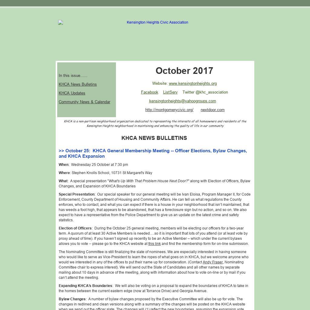 Special Presentation: Our special speaker for our general meeting will be Ivan Eloisa, Program Manager II, for Code Enforcement, County Department of Housing and Community Affairs. He can tell us what regulations the County enforces, who to contact, and what you can expect if there is a house in your neighborhood that isn’t maintained, that has weeds a foot high, that appears to be abandoned, that has a foreclosure sign but no action, and so on. We also expect to have a representative from the Police Department to give us an update on the latest crime and safety statistics. Election of Officers: During the October 25 general meeting, members will be electing our officers for a two-year term. A quorum of at least 30 Active Members is needed….so it is important that lots of you attend (or at least vote by proxy ahead of time). If you haven’t signed up recently to be an Active Member – which under the current bylaws allows you to vote -- please go to the KHCA website at this link and find the membership form for on-line submission. The Nominating Committee is still finalizing the slate of nominees. We are especially interested in having someone who would like to serve as Vice-President to learn the ropes of what goes on in KHCA, but we welcome anyone who would we interested in any of the offices to put their name up for consideration. (Contact Andy Fraser, Nominating Committee chair to express interest). We will send out the Slate of Candidates and all other names by separate mailing about 10 days in advance of the meeting, along with information about how to vote on-line or by mail if you can’t attend the meeting. Expanding KHCA’s Boundaries: We will also be voting on a proposal to expand the boundaries of KHCA to take in the homes between the current eastern edge (now at Torrance Drive) and Georgia Avenue. Bylaw Changes: A number of bylaw changes proposed by the Executive Committee will also be up for vote. The changes in redlined and clean versions along with a summary of the changes will be posted on the KHCA website when we send out the officer slate. The changes will (1) reflect the new boundaries, assuming the expansion vote passes; (2) streamline and clarify the process of officer elections; (3) eliminate the need to sign up as an “Active Member” every two years; and (4) return to the use of dues payment as a condition of being a “Voting Member.” The dues would be minimal ($10 per adult voting resident to a maximum of $30 per address), but they will help ensure that KHCA remains financially viable.