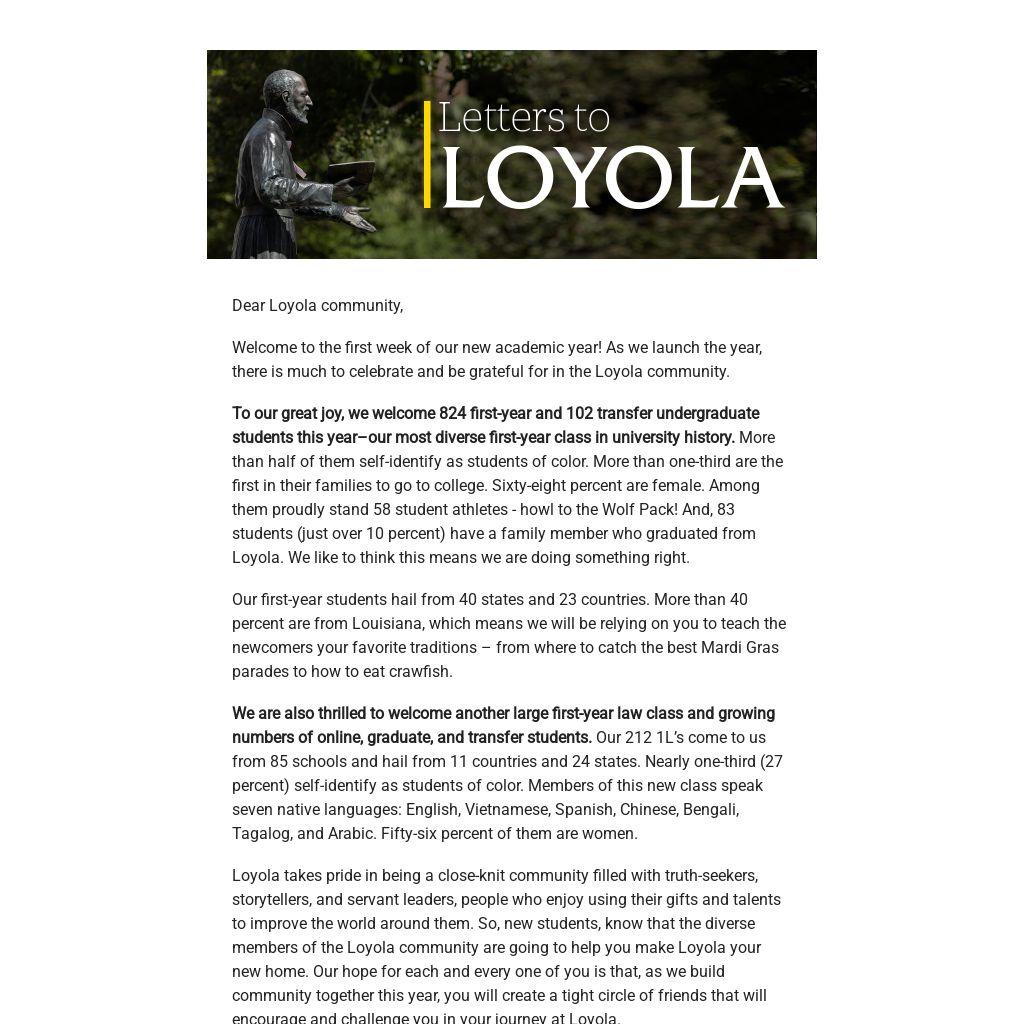 Welcome to the first week of our new academic year! As we launch the year, there is much to celebrate and be grateful for in the Loyola community.