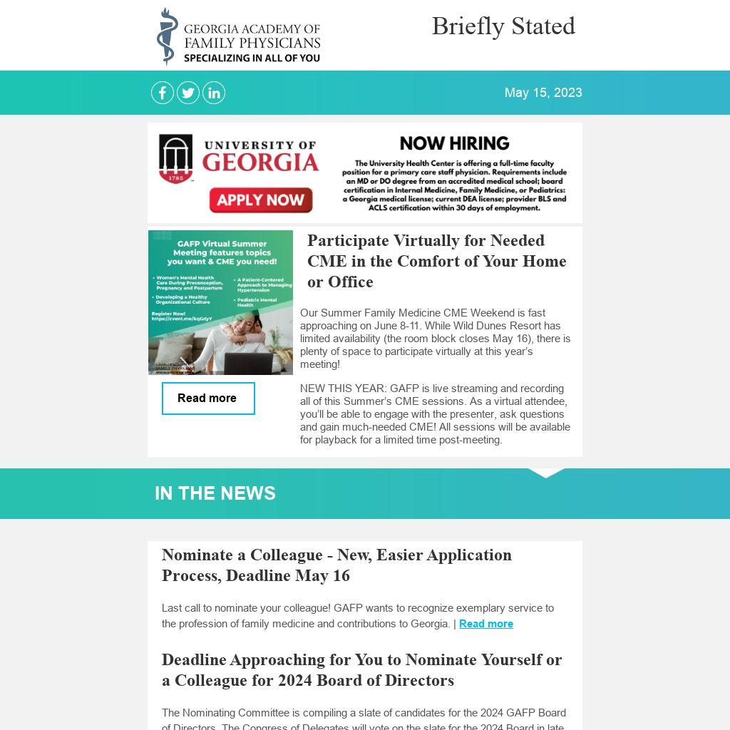 The Nominating Committee is compiling a slate of candidates for the 2024 GAFP Board of Directors. The Congress of Delegates will vote on the slate for the 2024 Board in late summer. (Residents and Medical Students will hold their own elections in the fall.) | Read more