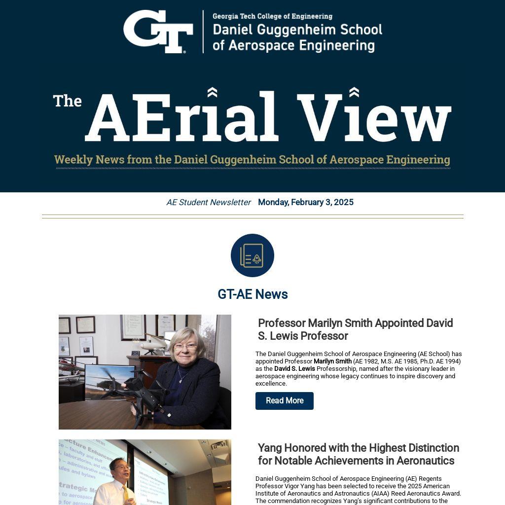 The Daniel Guggenheim School of Aerospace Engineering (AE School) has appointed ProfessorĀ Marilyn SmithĀ (AE 1982, M.S. AE 1985, Ph.D. AE 1994) as theĀ David S. LewisĀ Professorship, named after the visionary leader in aerospace engineering whose legacy continues to inspire discovery and excellence.Ā