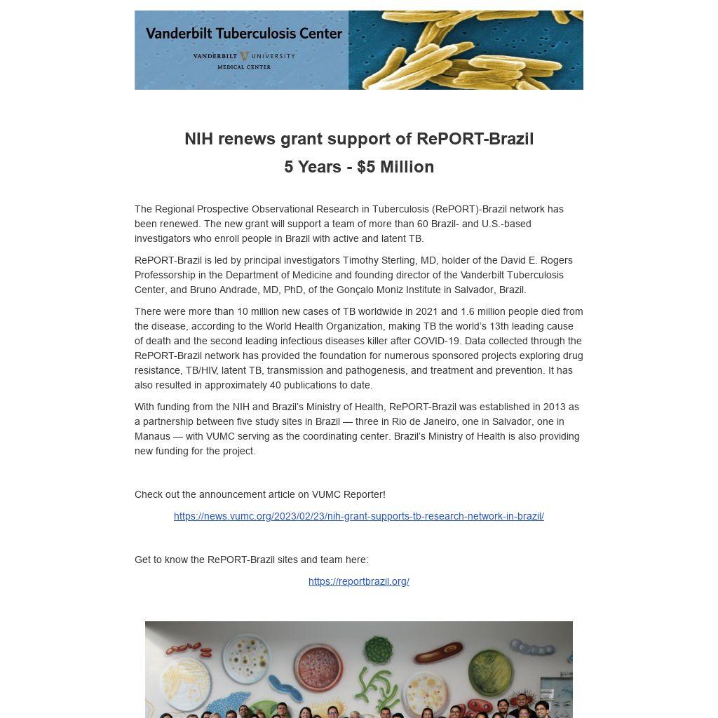 The Regional Prospective Observational Research in Tuberculosis (RePORT)-Brazil network has been renewed. The new grant will support a team of more than 60 Brazil- and U.S.-based investigators who enroll people in Brazil with active and latent TB.