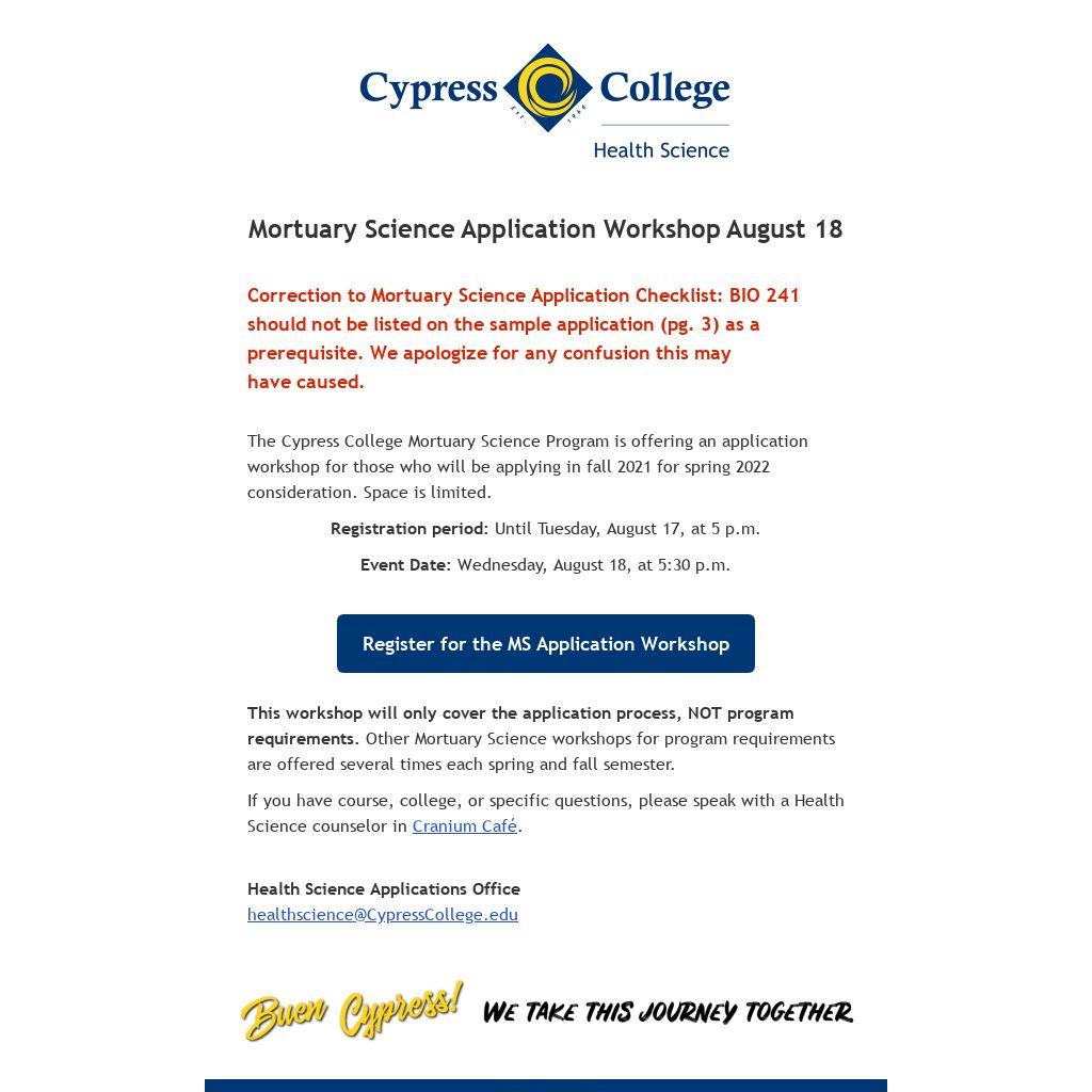 The Cypress College Mortuary Science Program is offering an application workshop for those who will be applying in fall 2021 for spring 2022 consideration. Space is limited.