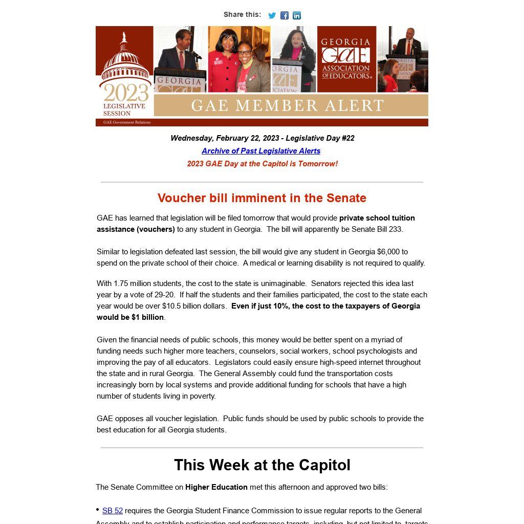 GAE has learned that legislation will be filed tomorrow that would provide private school tuition assistance (vouchers) to any student in Georgia. The bill will apparently be Senate Bill 233.