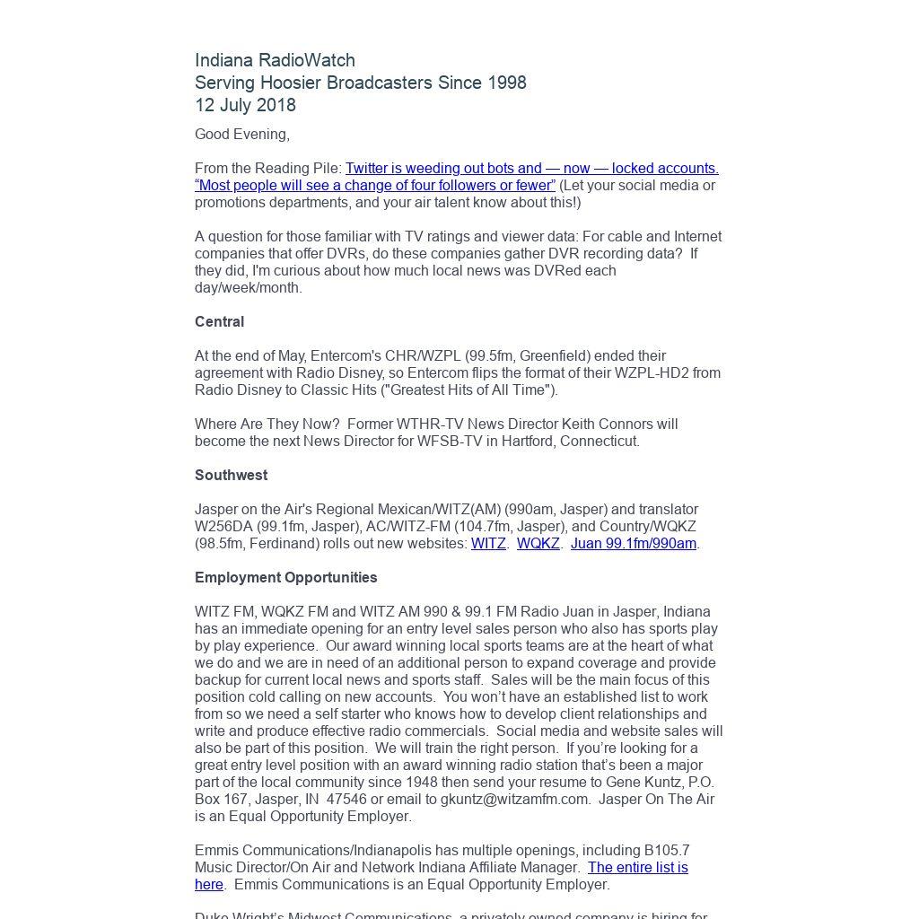 Indiana RadioWatch subscriptions are free. To subscribe, send an e-mail to irw@well.com and we'll add you. After publication, we archive Indiana RadioWatch on the Indiana Radio Archive at http://www.indianaradio.net. Please e-mail us your news stories and employment opportunities.