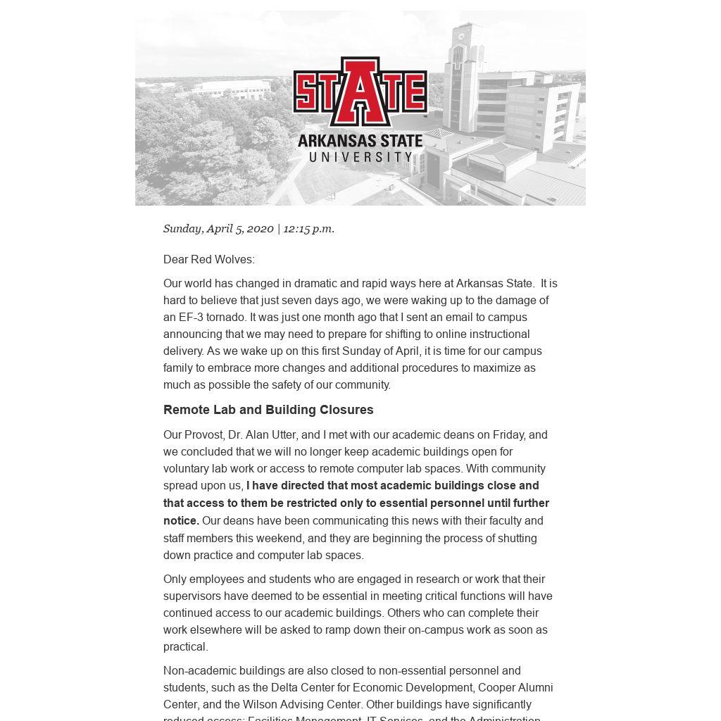 Our world has changed in dramatic and rapid ways here at Arkansas State. It is hard to believe that just seven days ago, we were waking up to the damage of an EF-3 tornado. It was just one month ago that I sent an email to campus announcing that we may need to prepare for shifting to online instructional delivery. As we wake up on this first Sunday of April, it is time for our campus family to embrace more changes and additional procedures to maximize as much as possible the safety of our community.