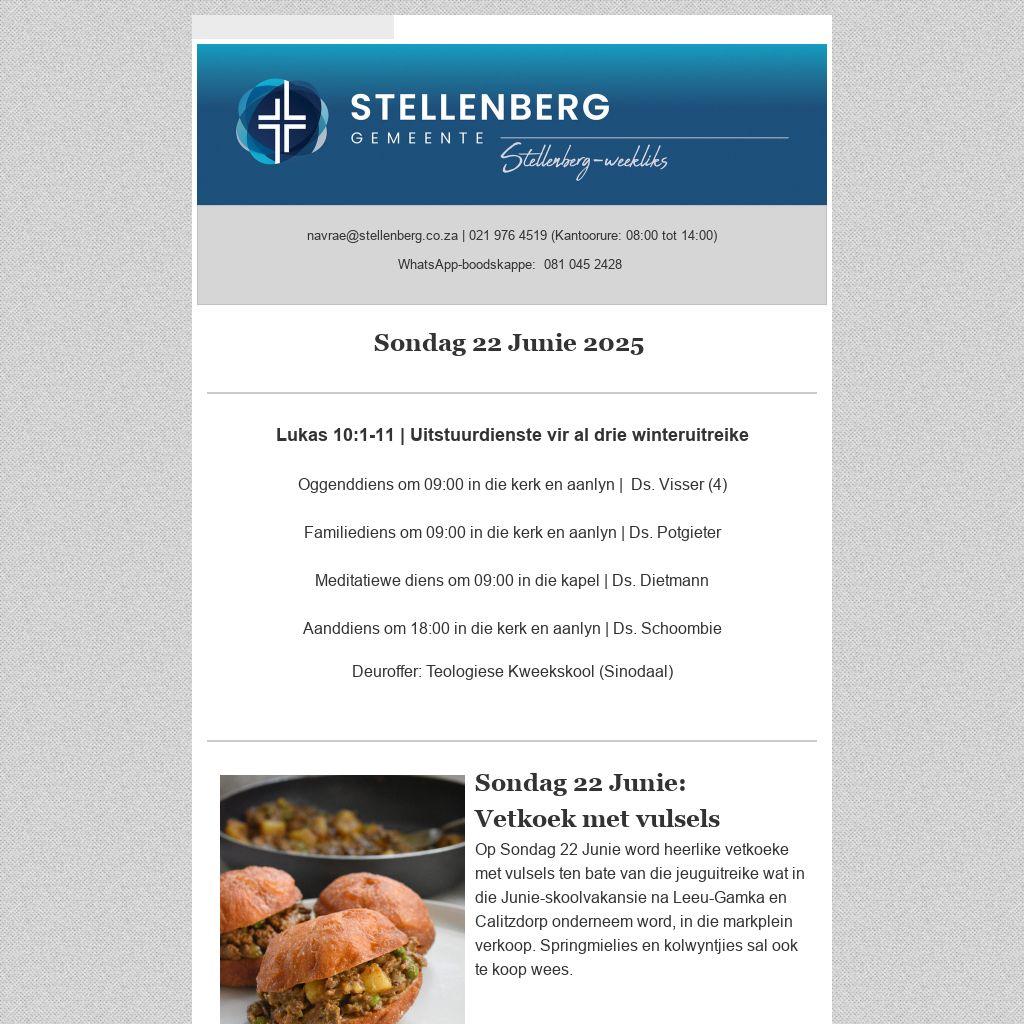 Jy kan gemeentenuus weekliks deur middel van die Stellenberg-weekliks per e-pos ontvang. Stuur jou e-posadres aan sanel@stellenberg.co.za. - Op jou selfoon: