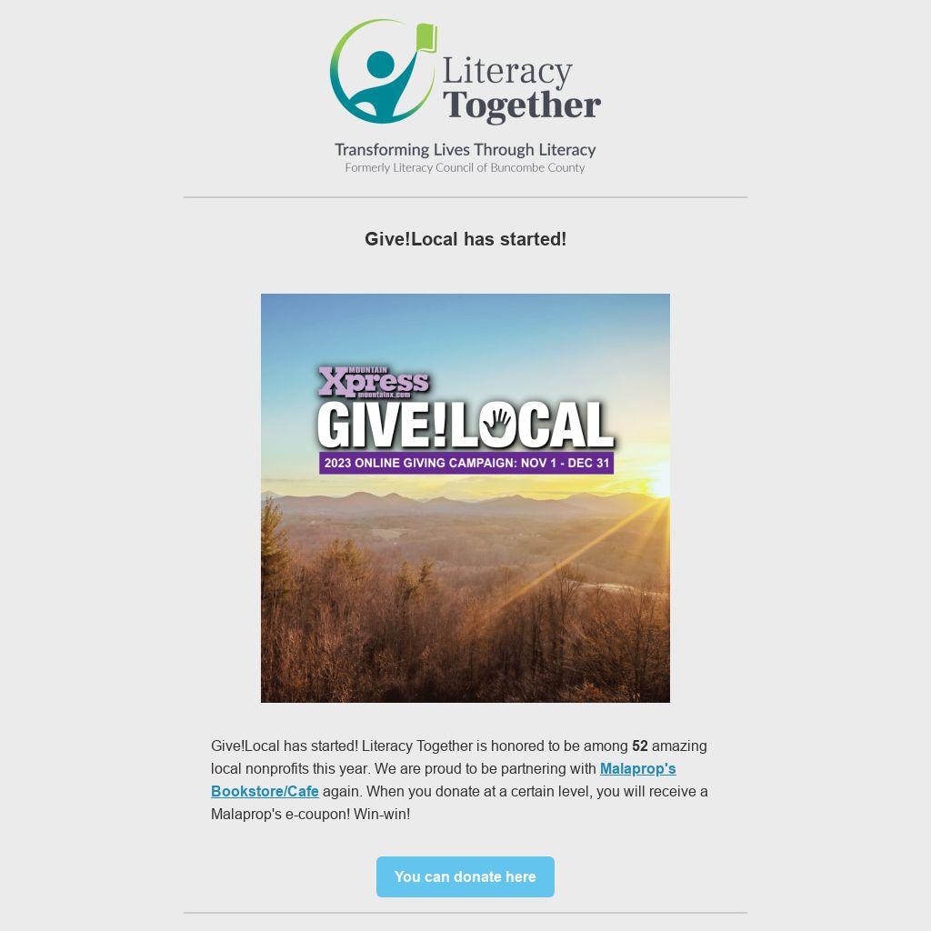 Give!Local has started! Literacy Together is honored to be among 52 amazing local nonprofits this year. We are proud to be partnering with Malaprop's Bookstore/Cafe again. When you donate at a certain level, you will receive a Malaprop's e-coupon! Win-win!