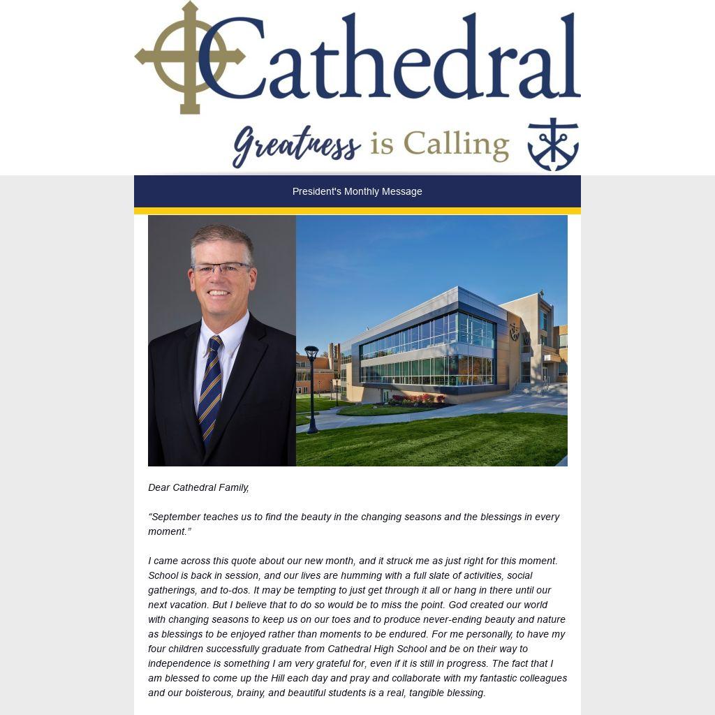 I came across this quote about our new month, and it struck me as just right for this moment. School is back in session, and our lives are humming with a full slate of activities, social gatherings, and to-dos. It may be tempting to just get through it all or hang in there until our next vacation. But I believe that to do so would be to miss the point. God created our world with changing seasons to keep us on our toes and to produce never-ending beauty and nature as blessings to be enjoyed rather than moments to be endured. For me personally, to have my four children successfully graduate from Cathedral High School and be on their way to independence is something I am very grateful for, even if it is still in progress. The fact that I am blessed to come up the Hill each day and pray and collaborate with my fantastic colleagues and our boisterous, brainy, and beautiful students is a real, tangible blessing.