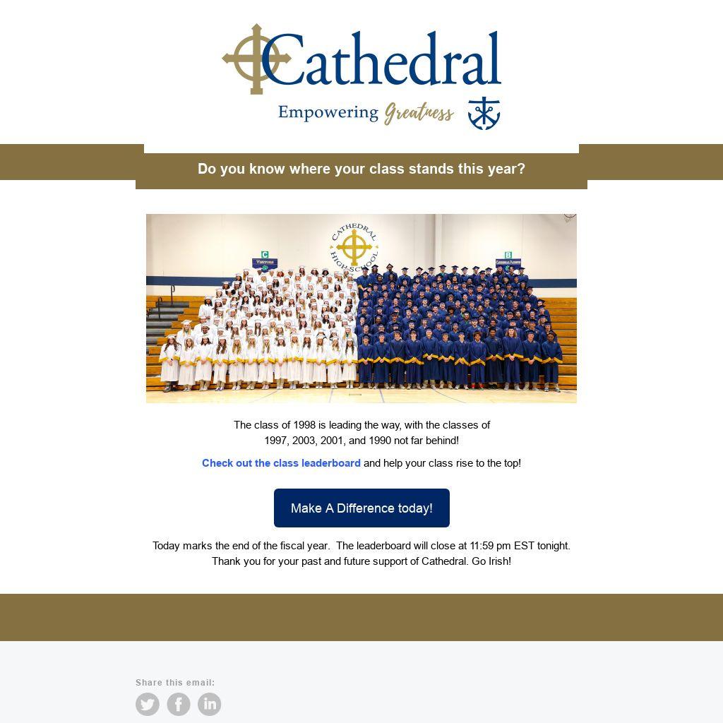 Today marks the end of the fiscal year. The leaderboard will close at 11:59 pm EST tonight. Thank you for your past and future support of Cathedral. Go Irish!