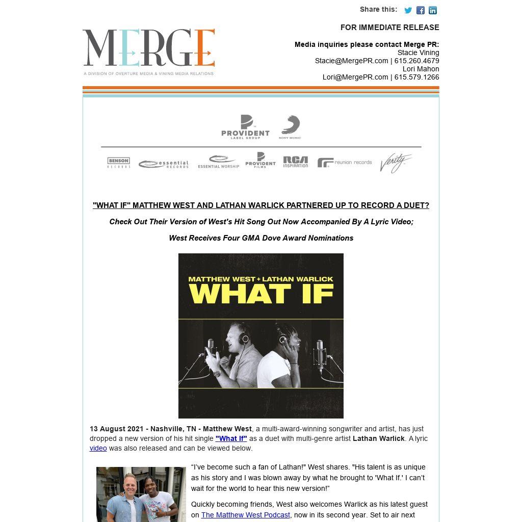| 13 August 2021 - Nashville, TN - Matthew West, a multi-award-winning songwriter and artist, has just dropped a new version of his hit single "What If" as a duet with multi-genre artist Lathan Warlick. A lyric video was also released and can be viewed below.