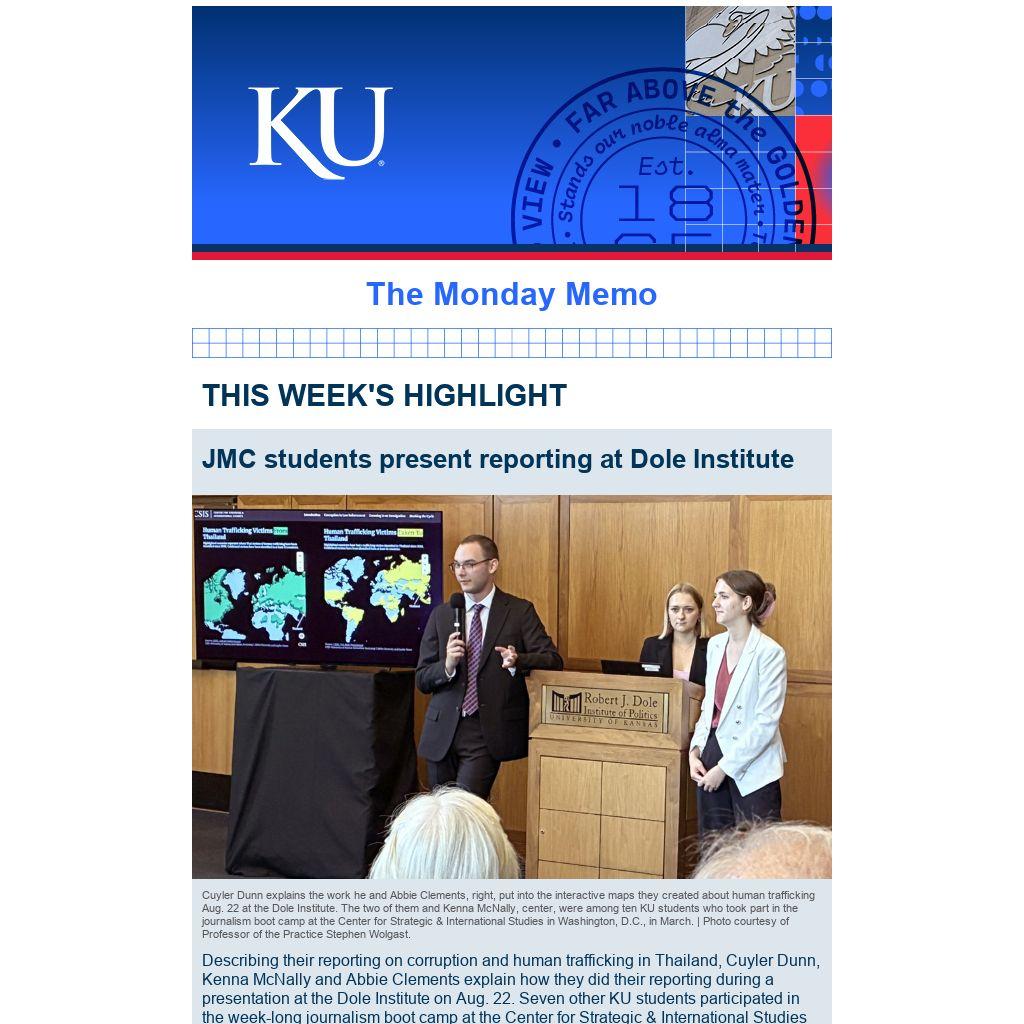Describing their reporting on corruption and human trafficking in Thailand, Cuyler Dunn, Kenna McNally and Abbie Clements explain how they did their reporting during a presentation at the Dole Institute on Aug. 22. Seven other KU students participated in the week-long journalism boot camp at the Center for Strategic & International Studies in Washington, D.C., during spring break. Their work is online here. During the Dole event, Stephen Wolgast, professor of the practice of journalism, announced that KU had been invited to return to CSIS for another journalism boot camp.