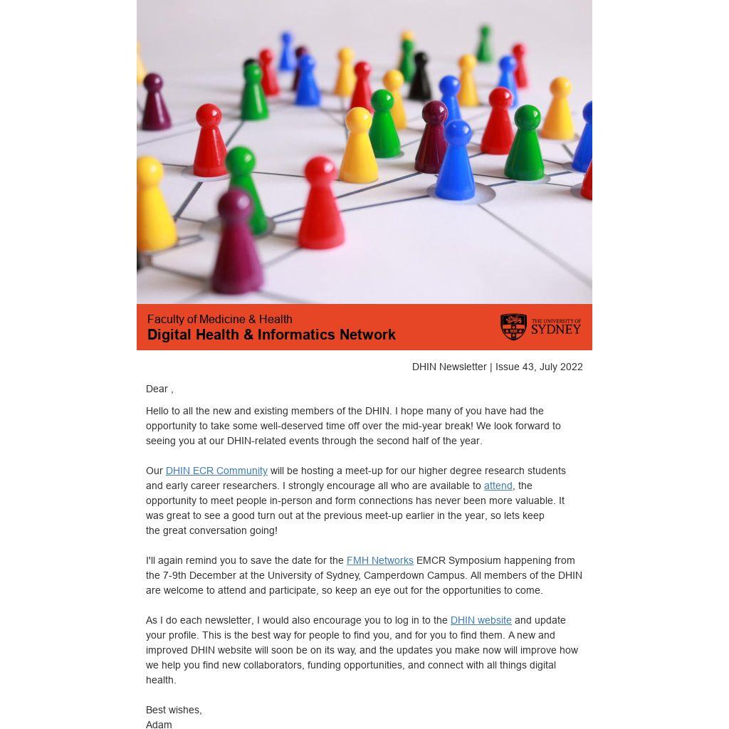 DHIN ECR Community Meet-UpWednesday 10th August, 10am - 11:30am, Taste Baguette at Charles Perkins CentreWe invite all higher degree research students and early career researchers with an interest in digital health to join us for a free morning tea (drinks and food), great conversation and making new connections within the Digital Health ECR Community! We’re here to break the ice, connect face-to-face and chat about all the amazing research happening! Learn more and register.