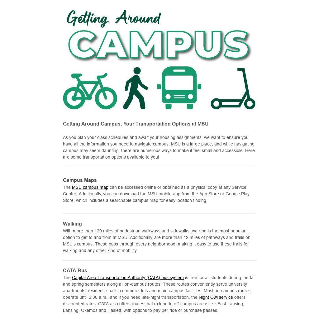 As you plan your class schedules and await your housing assignments, we want to ensure you have all the information you need to navigate campus. MSU is a large place, and while navigating campus may seem daunting, there are numerous ways to make it feel small and accessible. Here are some transportation options available to you!