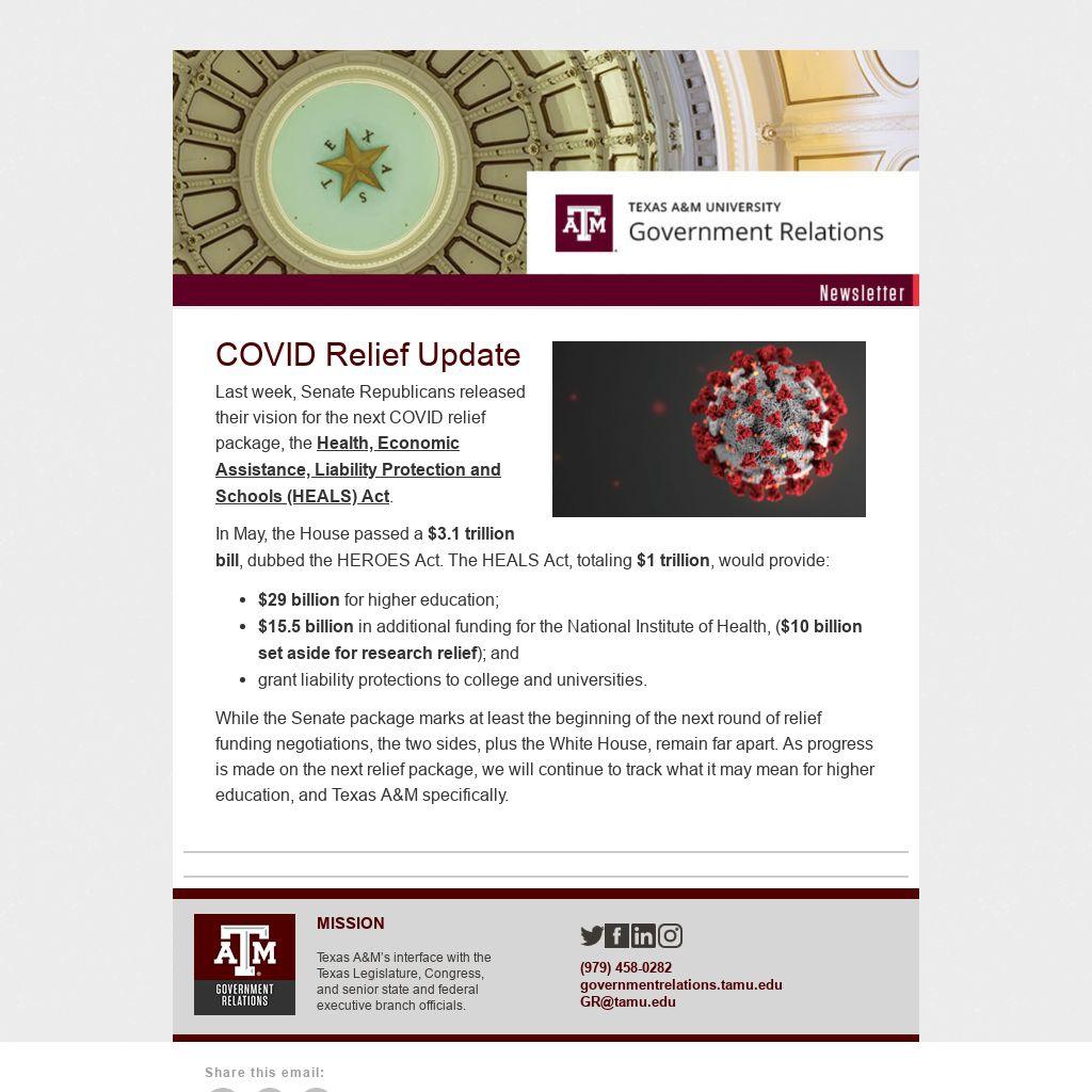 While the Senate package marks at least the beginning of the next round of relief funding negotiations, the two sides, plus the White House, remain far apart. As progress is made on the next relief package, we will continue to track what it may mean for higher education, and Texas A&M specifically.