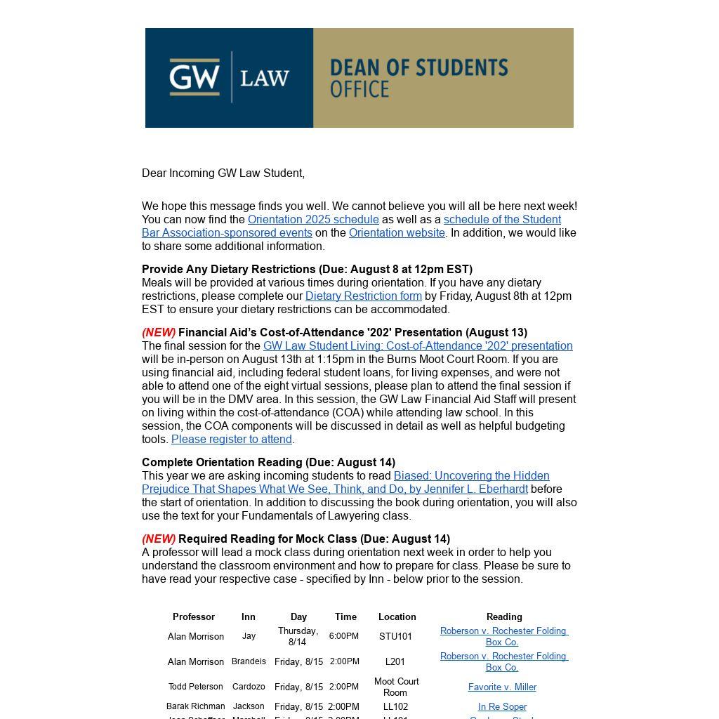 The final session for the GW Law Student Living: Cost-of-Attendance '202' presentation will be in-person on August 13th at 1:15pm in the Burns Moot Court Room. If you are using financial aid, including federal student loans, for living expenses, and were not able to attend one of the eight virtual sessions, please plan to attend the final session if you will be in the DMV area. In this session, the GW Law Financial Aid Staff will present on living within the cost-of-attendance (COA) while attending law school. In this session, the COA components will be discussed in detail as well as helpful budgeting tools. Please register to attend.