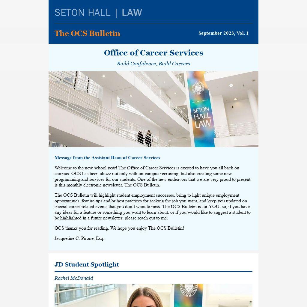 Welcome to the new school year! The Office of Career Services is excited to have you all back on campus. OCS has been abuzz not only with on-campus recruiting, but also creating some new programming and services for our students. One of the new endeavors that we are very proud to present is this monthly electronic newsletter, The OCS Bulletin.