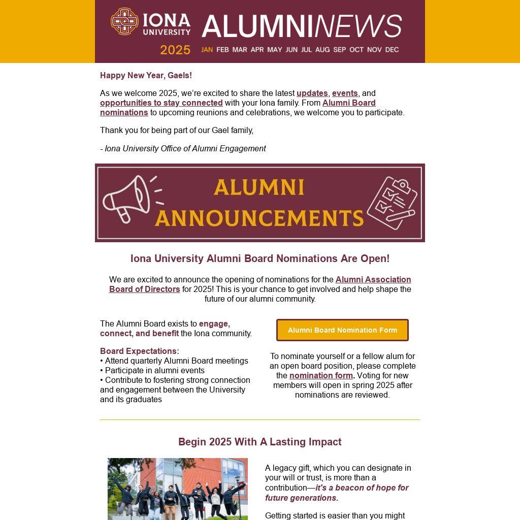As we welcome 2025, we’re excited to share the latest updates, events, and opportunities to stay connected with your Iona family. From Alumni Board nominations to upcoming reunions and celebrations, we welcome you to participate.