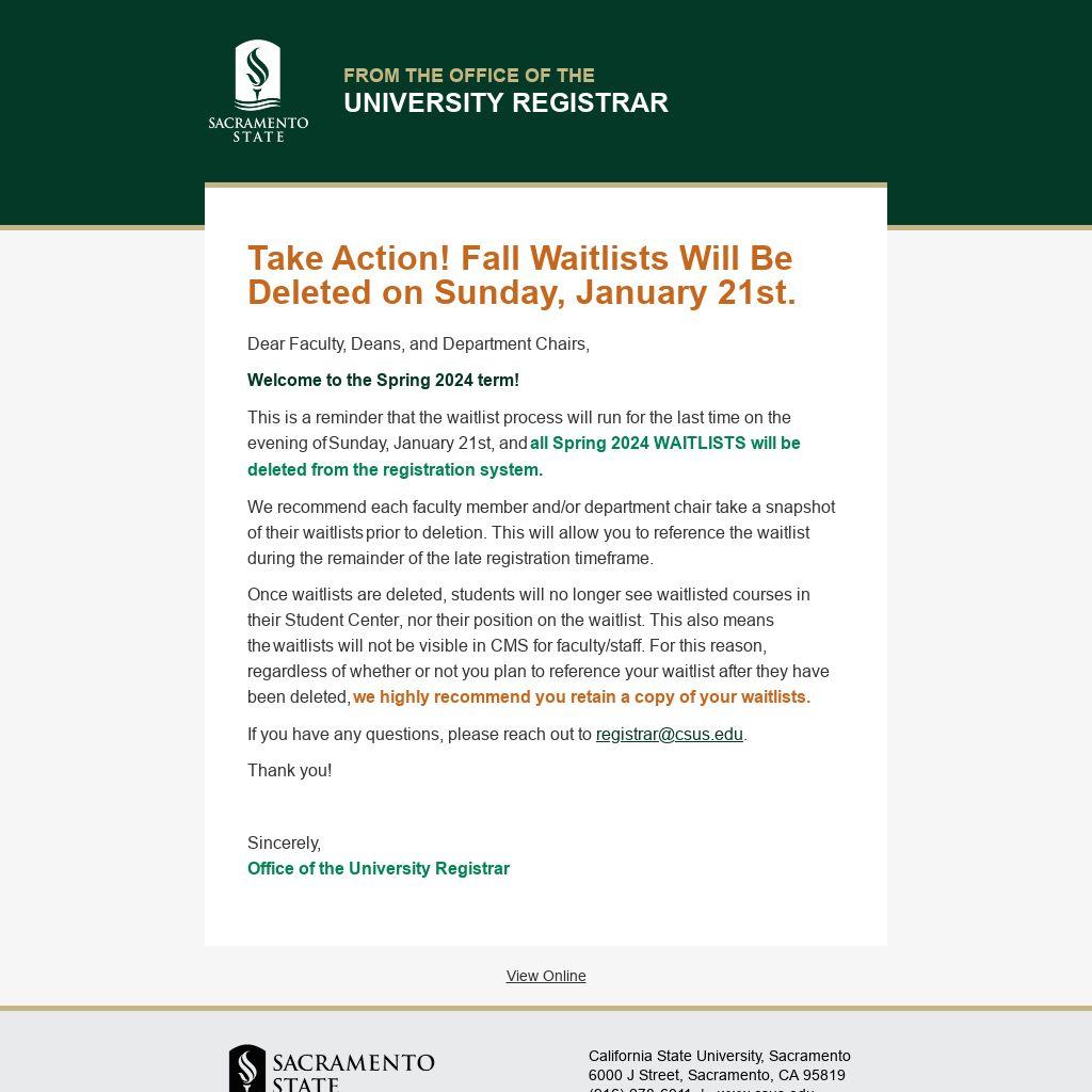 This is a reminder that the waitlist process will run for the last time on the evening of Sunday, January 21st, and all Spring 2024 WAITLISTS will be deleted from the registration system.