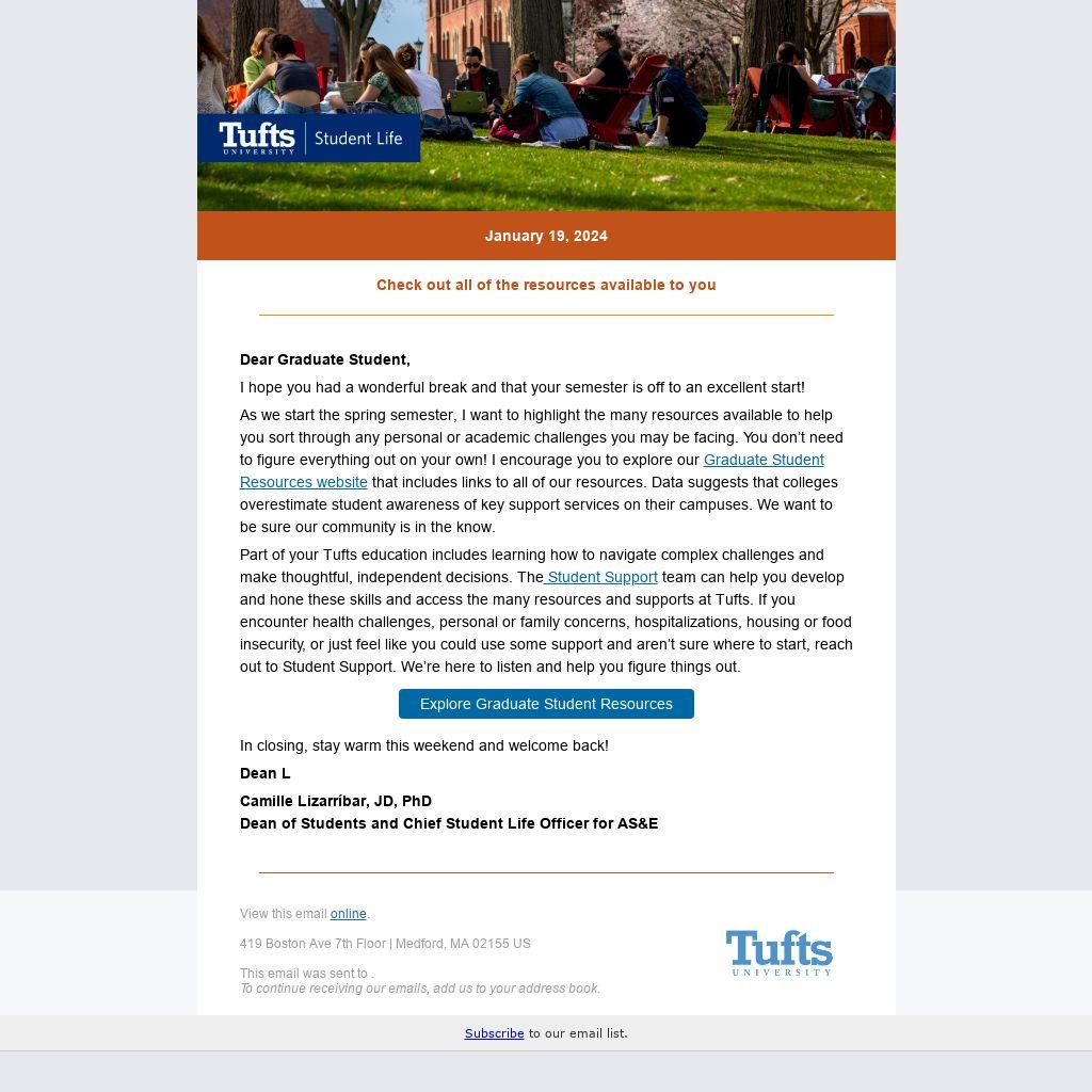 Part of your Tufts education includes learning how to navigate complex challenges and make thoughtful, independent decisions. The Student Support team can help you develop and hone these skills and access the many resources and supports at Tufts. If you encounter health challenges, personal or family concerns, hospitalizations, housing or food insecurity, or just feel like you could use some support and aren’t sure where to start, reach out to Student Support. We’re here to listen and help you figure things out.
