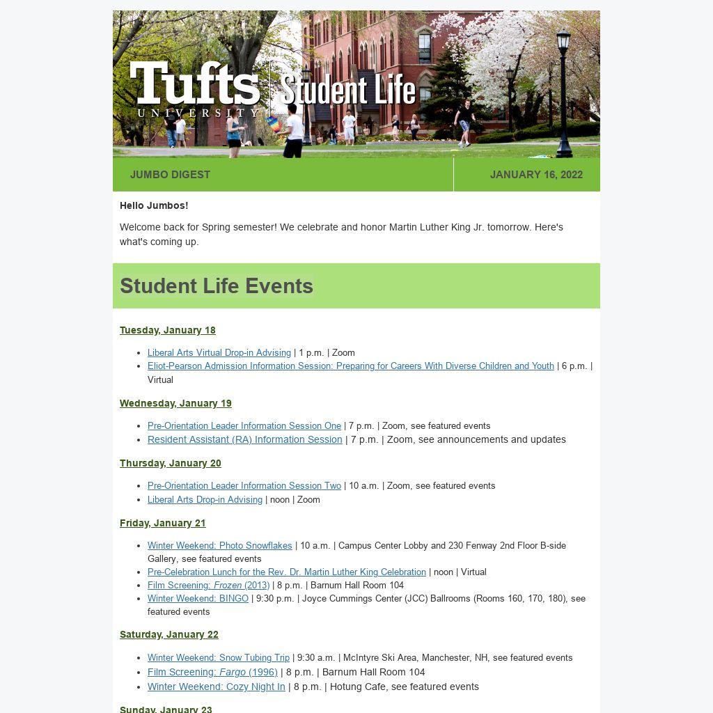 Students and Student Organizations can submit events to JumboLife! Add your event by Thursday at noon each week, and we'll include it in the Jumbo Digest on Sunday.